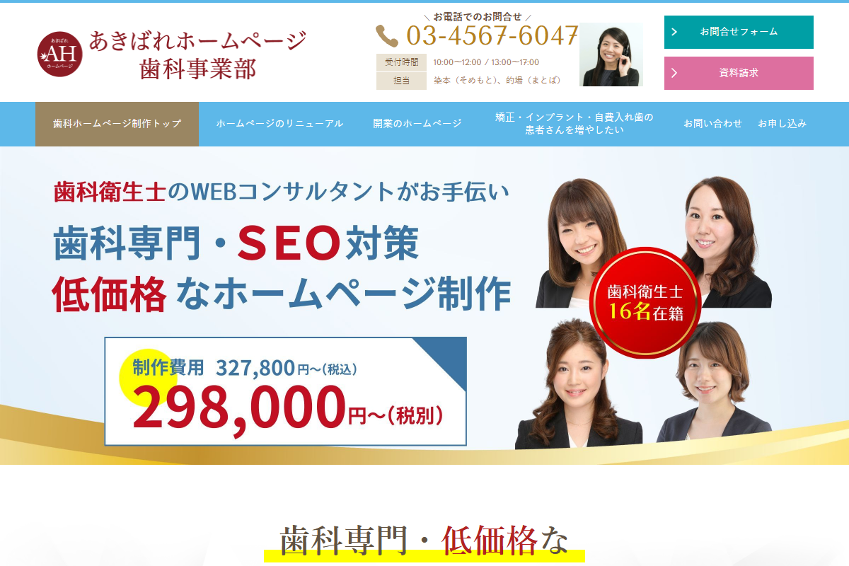 | あきばれHP | 298,000円〜(税抜) | 4,900円〜(税抜) | 歯科専門部門・15種超のプラン |