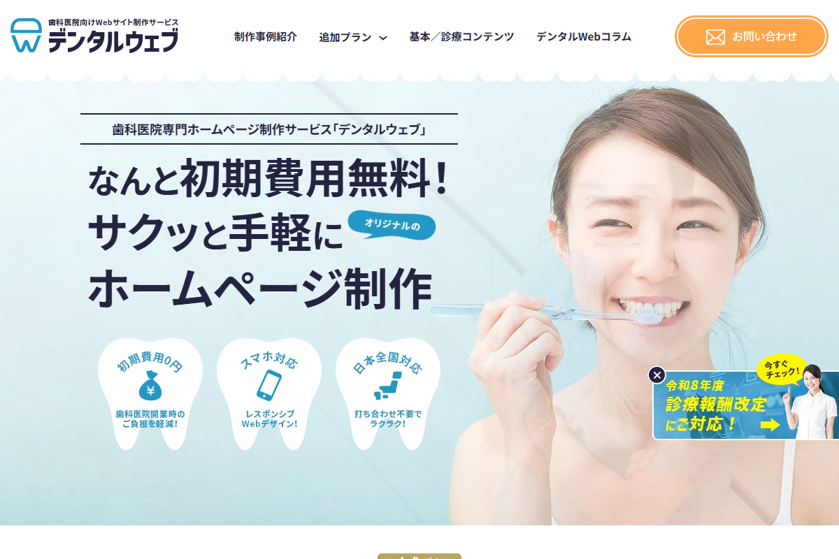 | デンタルウェブ | 0円(テンプレート) | 10,890円(税込) | 歯科専門・初期費用0円の月額制 |
