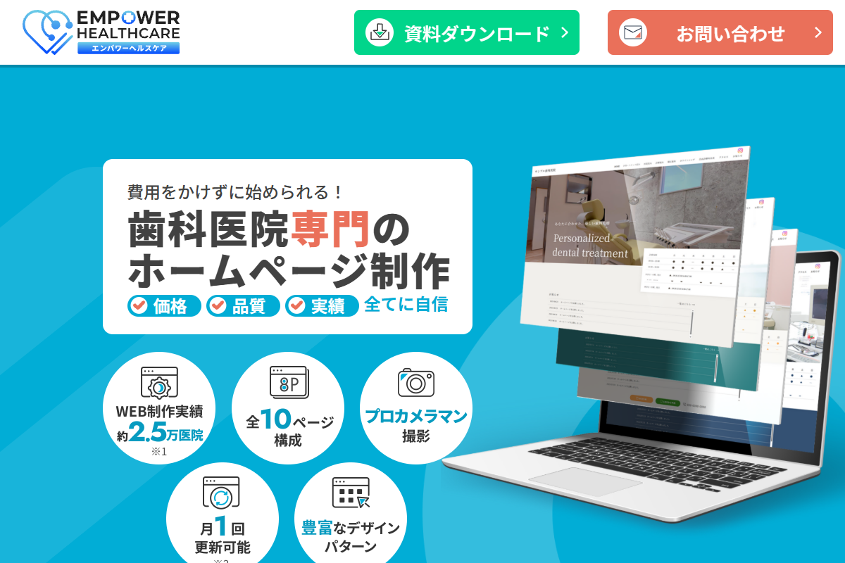 169業種・10,000社以上の制作実績を持つ大手サービスの歯科専門部門です。15種類以上のプランから医院の規模や予算に合わせて選べます。ライターによる患者目線のコピーライティングとプロカメラマンの撮影がセットになっており、制作費298,000円〜は相場の半額以下。自社CMSで院側での更新も簡単です。