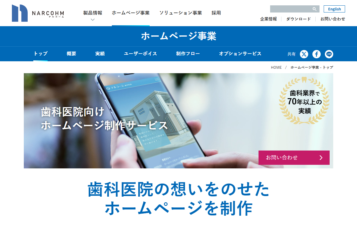 歯科用機材メーカーとして70年以上の歴史を持つ企業のWeb制作部門です。歯科業界への深い理解が最大の強みで、歯科衛生士の資格を持つWebコンサルタントが担当してくれます。歯科HP制作実績は1,000件以上。診療カレンダーの更新など、歯科医院ならではの運用ニーズにも保守プランで対応しています。