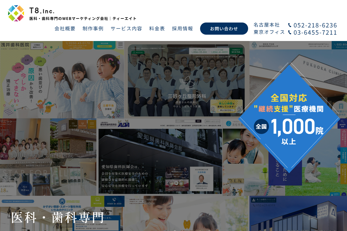 | ティーエイト | 要問い合わせ | 要問い合わせ | 医科・歯科専門10年超・歯科400件超 |